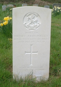| Henry John Polley was a Lance Corporal (service number 18048) in the 10th Battn Queen's Own (Royal West Kent Regt). On 13th July 1917 the Battalion was part of the 41st Brigade and was involved in the Flanders Offensive, but Henry died aged 28 and is buried in St.Giles Churchyard, Mountnessing. The churchyard has a total of 5 Commonwealth War Graves. | |||||||