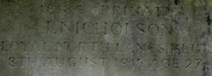 | James Nicholson may have nothing to do with Mountnessing he came from Liverpool yet he is buried in St Giles churchyard. He was a private with the Loyal North Lancashire Regt 11th Battn and he died 8th August 1915 aged 27. According to Soldiers Died in the Great War however he died at home in 1918. | |||||||