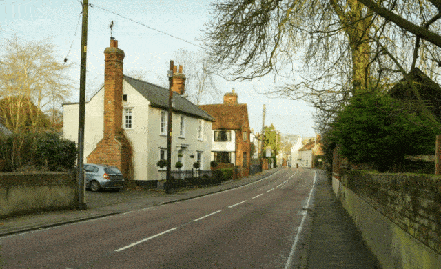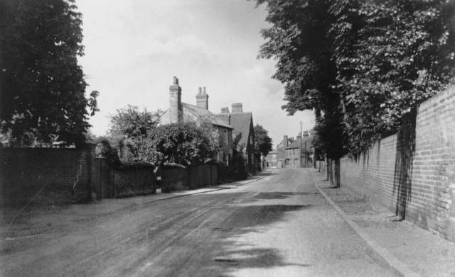 | The High Street looking towards the village centre from the south. In the middle distance is Tudor Cottage. | ||