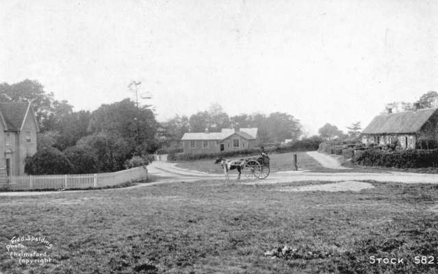 | The view from the Glebe at end of the 19th Century and when horsepower was horse power. On the left is Bellmans, on the right the Almshouses and in the centre the National School. | ||