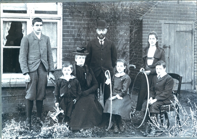 | Evans family group presumably taken at the old Schoolhouse. Hubert and Gladys are not on the picture so it must have been taken at the latest in 1898 as Hubert was 3 in the 1901 census. | |||