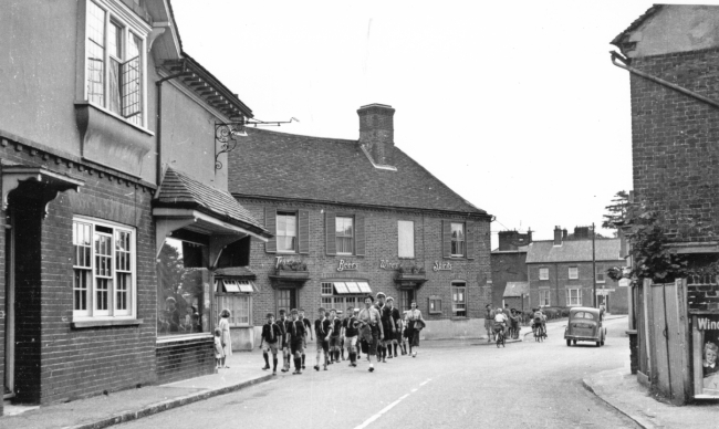 The Scouts on parade in 1950s passing the Cock and Wright's the butchers