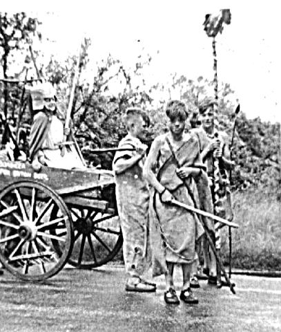 | This shows the 1st Stock Scouts entry in the village Coronation parade. Boudicea (in the chariot - trek cart) is Jonny Cottee. The Ancient Brits are David Elliott, Robin Smith and Ben Curtis. | ||