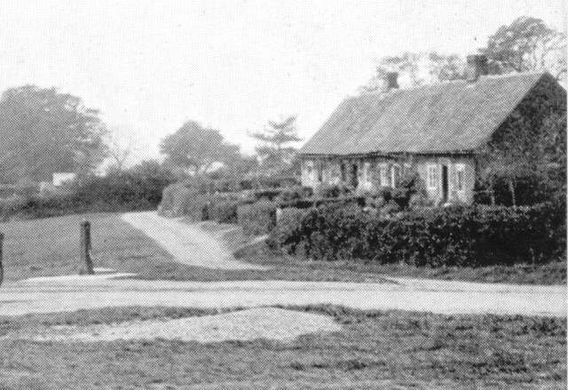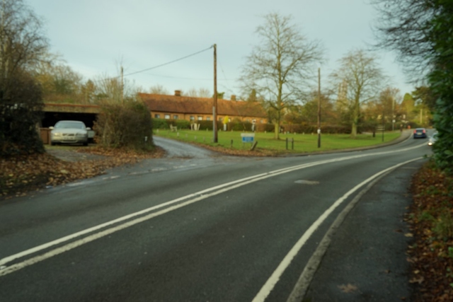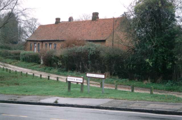 Where Stock Road becomes the High Street. Behind are the Almshouses. These were built in the late 17th Century. Some people mistakenly think that they are Elizabethan.