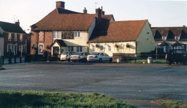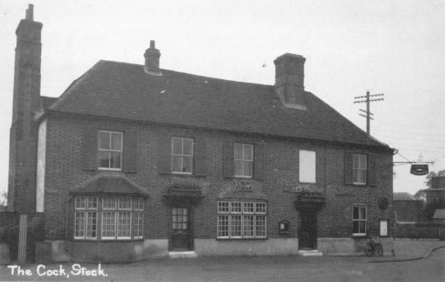 | The Cock - looking across the car park. The boundary of Stock and Buttsbury used to run right through the middle of The Cock. A man once dropped down dead in the pub and his body fell across the border. Half was in Stock and half in Buttsbury. They didn't know in which parish to bury him. It was eventually decided that he should be buried in the parish in which his head fell. The car park was at one time a field where fun fairs were held and after that it became part of the new school playground. The lower picture was taken in 1950 | |||
